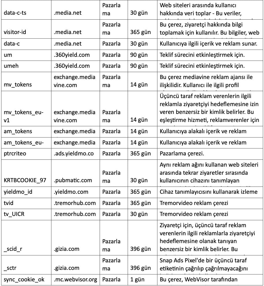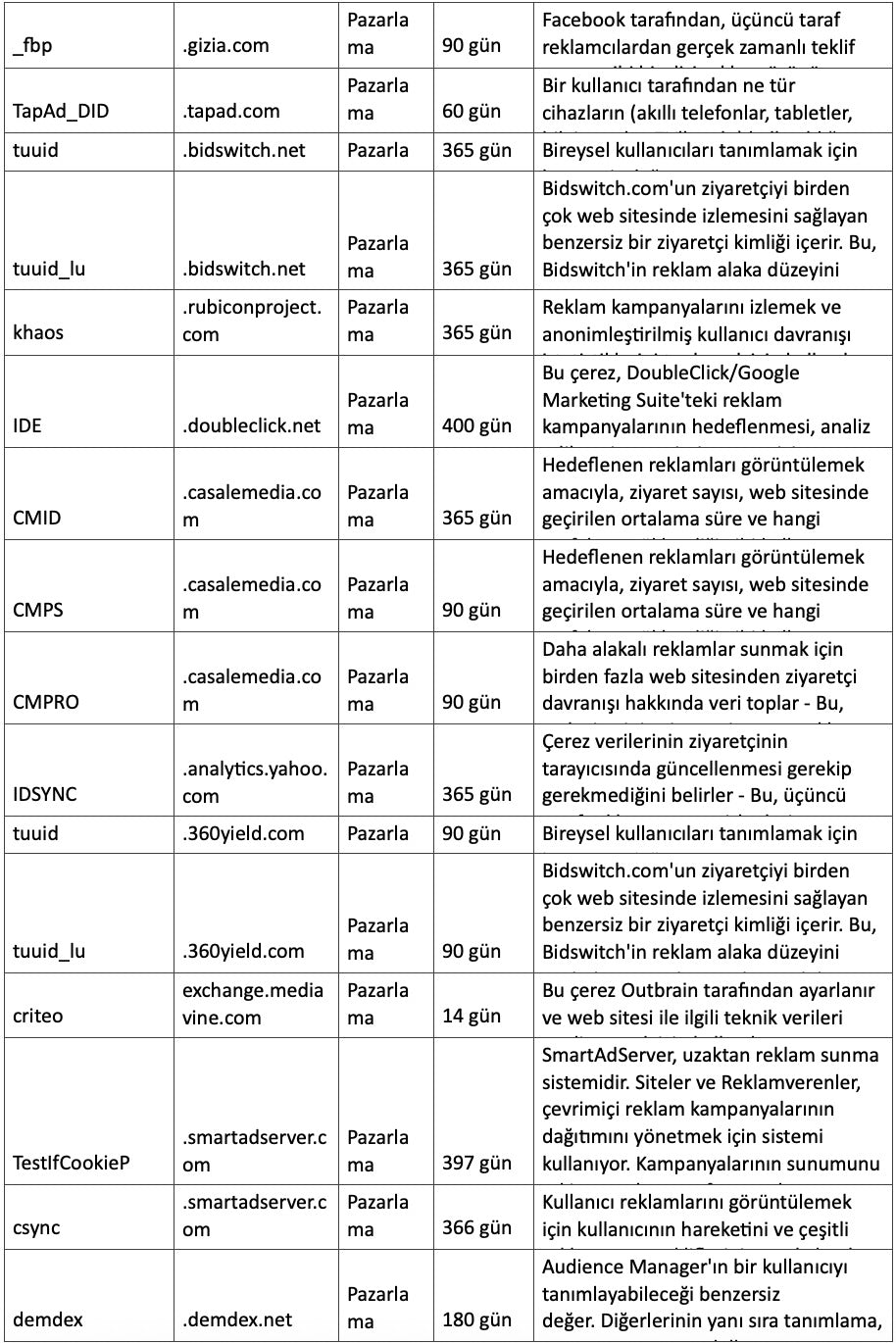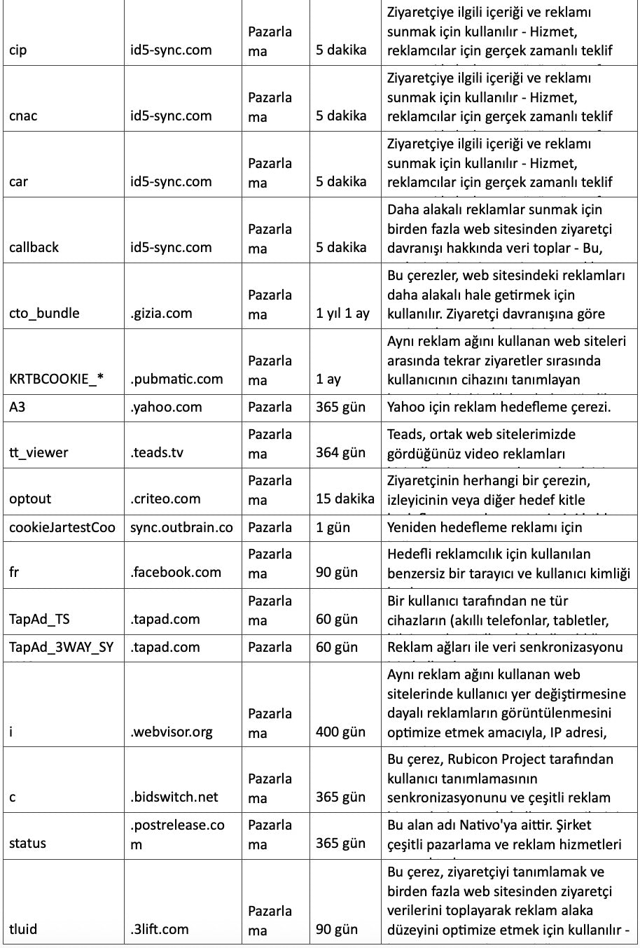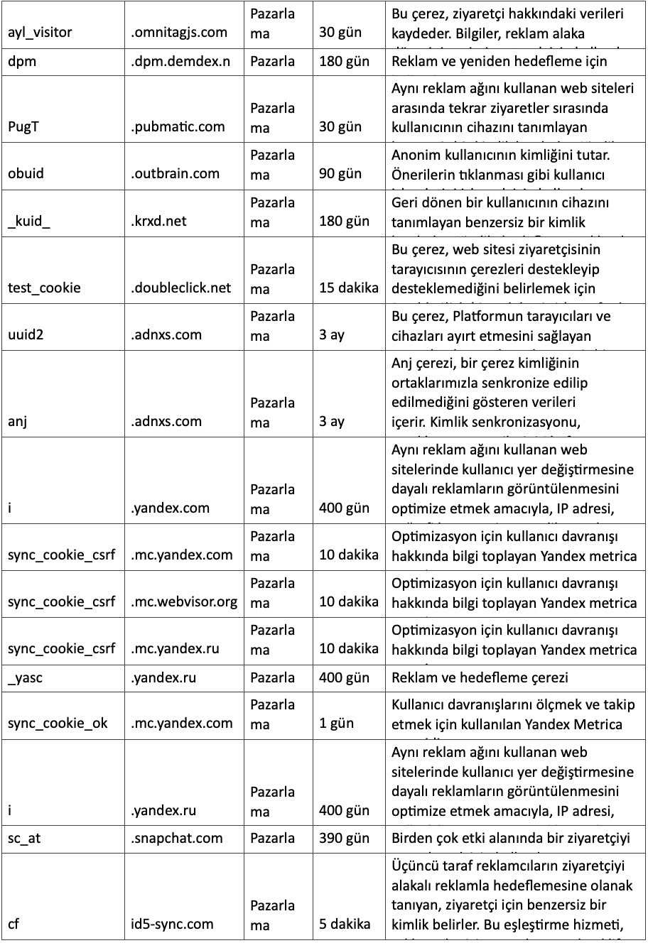4. Pazarlama Çerezleri: Bu çerezler reklamcılık alanındaki iş ortaklarımız tarafından kullanılabilirler Bu reklam şirketleri sizin ilgi alanlarınıza göre profilleme yapabilir ve diğer gezindiğiniz web sitelerinde sizin ilginizi çekebilecek reklamları size gösterebilirler. Doğrudan kişisel bilgi saklamazlar, fakat sizin tarayıcıdaki ve internet cihazınızdaki sizi tanımlayan tekil kimliği kullanırlar. Eğer bu çerezlere izin vermezseniz, daha az hedefli pazarlamaya mazur kalırsınız.
