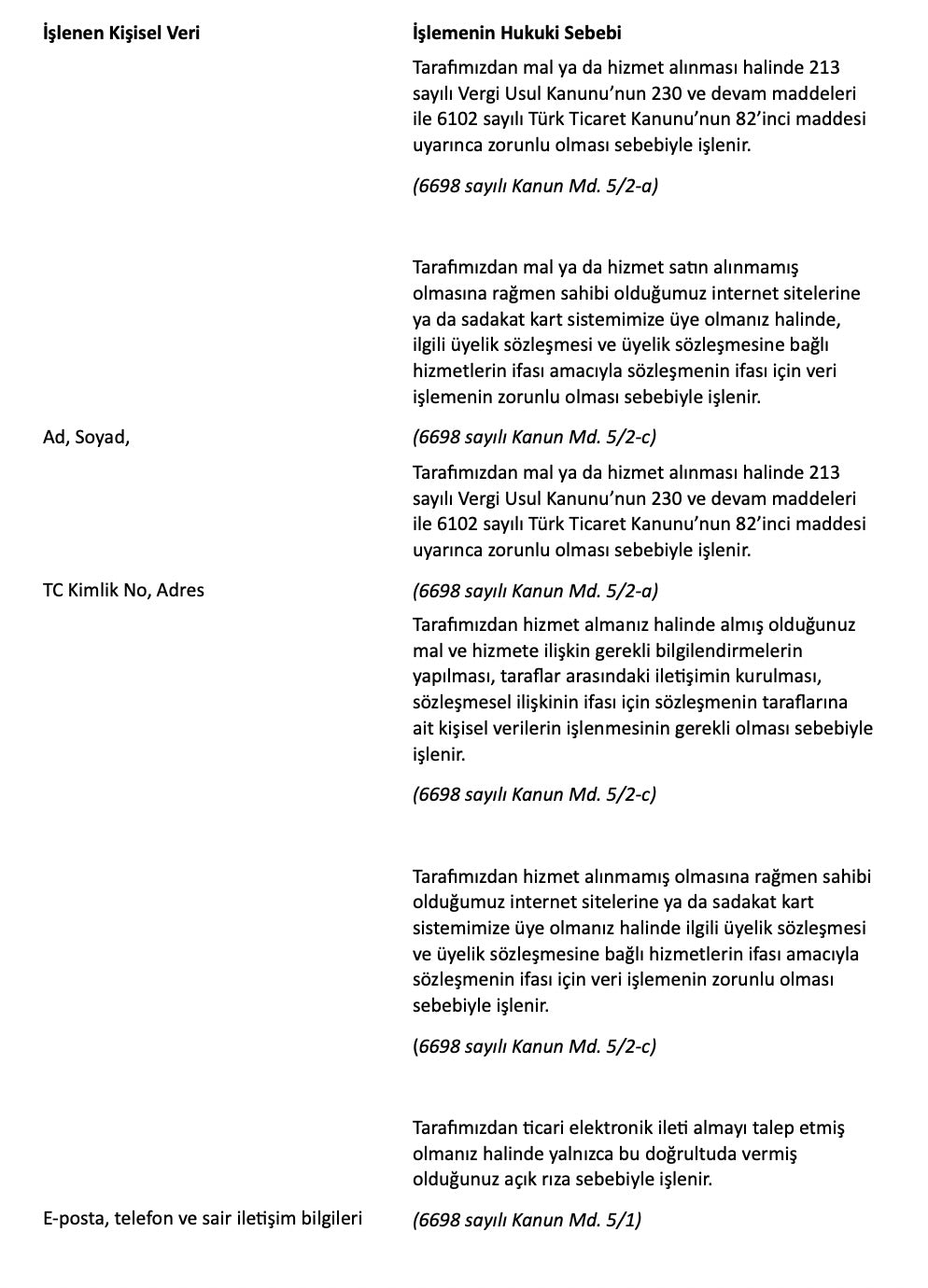 Bu kapsamda toplanan kişisel verilerinizin toplanmasında dayanılan hukuki sebepler verinin niteliğine uygun olarak; açık rıza, kanunlarda açıkça öngörülmesi, sözleşmenin ifası için veri işlemenin zorunlu olması, hukuki yükümlülüklerimizin yerine getirilebilmesi için zorunlu olması, veri sorumlusunun meşru menfaatleri için veri işlenmesinin zorunlu olması sebeplerinden biri uyarınca işlenir.