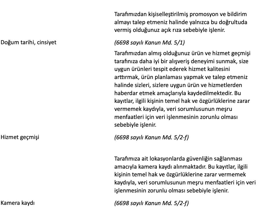 Kişisel verileriniz mağazalarımızdan ya da internet sitemizde doldurmuş olduğunuz formlar, tarafımıza mağaza temsilcilerimiz aracılığıyla ya da posta, e-posta, faks ve benzeri ortamlarda iletmiş olduğunuz bilgiler, tarafımızla yapacağınız sesli görüşmeler veya bizzat şirketimizde yapacağınız görüşmeler aracılığıyla toplanmaktadır. Toplanan kişisel verileriniz verinin niteliğine uygun olarak, yukarıda yer verilen amaçlar doğrultusunda hizmetlerimizin sunulabilmesi ve bu kapsamda sözleşmesel ve hukuki sorumluluklarımızın eksiksiz ve doğru bir şekilde yerine getirilebilmesi için 6102 sayılı Türk Ticaret Kanunu, 213 sayılı Vergi Usul Kanunu, 6502 sayılı Tüketicinin Korunması Hakkında Kanun, 6698 sayılı Kişisel Verilerin Korunması Kanunu başta olmak üzere mevzuat hükümlerinin tarafımıza yüklemiş olduğu mükellefiyetlerin yerine getirilebilmesi için toplanır.