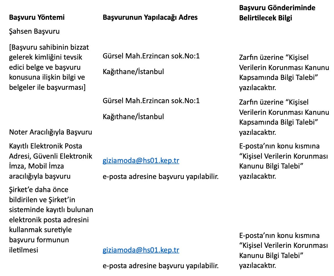 Başvuru formunda sağlamış olduğunuz bilgi ve belgeler yapmış olduğunuz başvurunun değerlendirilmesi, cevaplandırılması, cevabın tarafınıza ulaştırılması, kimliğinizin ve adresinizin tespiti amaçlarıyla sınırlı olarak GIZIA tarafından https://www.gizia.com/pages/kisisel-verilere-i̇liskin-aydinlatma-metni adresinde yer alan aydınlatma metni kapsamında işlenecektir.